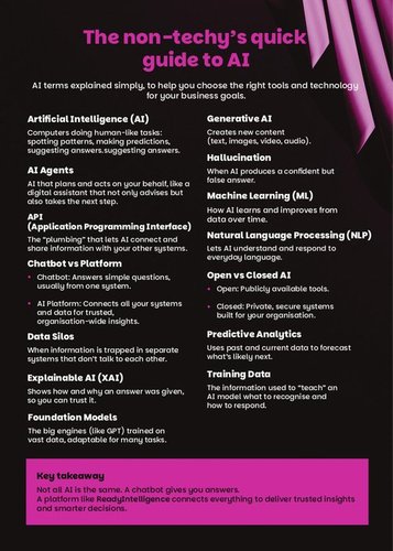 That’s why we’ve created The Non-Techy’s Quick Guide to AI — a simple, practical cheatsheet that demystifies key AI concepts so you can make smarter choices for your organisation. Whether you’re planning your first data project or evaluating AI-powered platforms, this guide helps you connect the dots between technology and your business goals.